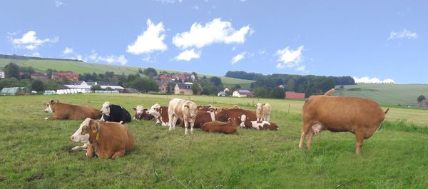 Aufgrund der anhaltend niedrigen Erzeugerpreise für Kuhmilch gaben wir die Milchproduktion nach 20 Jahren auf. Seither weideten Mutterkühe mit ihren Kälbern auf unseren Wiesen. Auf unserem Bauernhof sind außerdem Hühner, Wachteln, Hasen, Katzen und Schäferhündin Emma zu Hause.